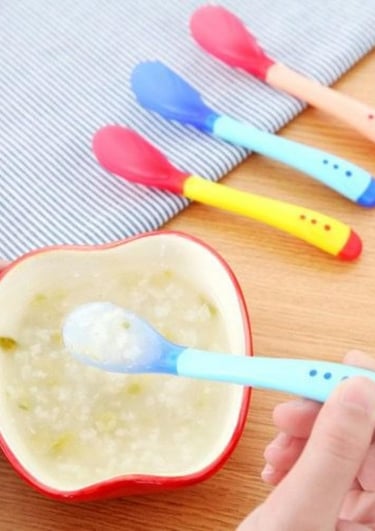 Talheres infantis termossensíveis que mudam de cor avisando quando a comida está quente demais, de silicone macio, atóxico e ideal para gengivas sensíveis